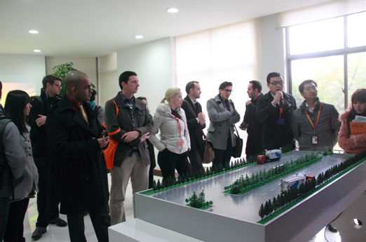 陪同过程中,事业部经理卢毅及首席科学家工作室陈振兴博士向其详细讲解了激光动态弯沉测量系统的产品原理、系统功能及目前取得的成果,并引领其观看和讲解了弯沉测量系统设备模型演示方案及弯沉测量系统工作界面方案。随后移步于生产车间,观看了卓越科技另一自主研发的智能道路检测系统。迪肯商学院代表们对其非常感兴趣并有秩序地登上智能道路检测系统,观看智能道路检测系统设备演示过程。