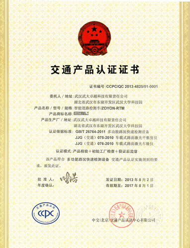 2013年8月2日,武汉武大卓越科技有限责任公司获得由中交(北京)产品认证中心有限公司颁发的交通产品认证证书。此次认证是对卓越科技产品在道路养护行业的实力又一次肯定。